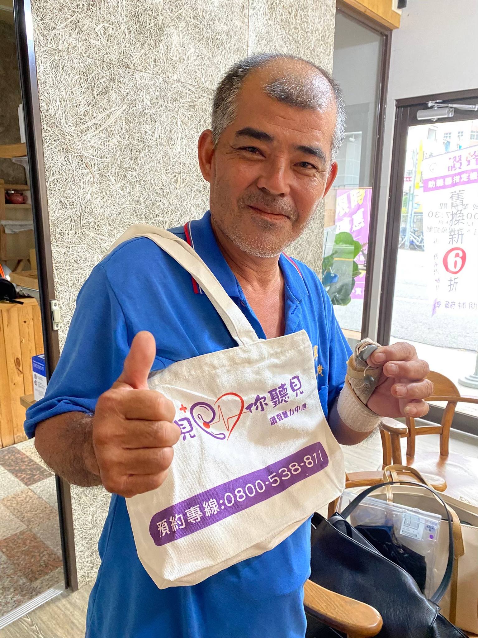 大哥在工地上班,沒有助聽器的話他的老闆會發瘋,所以哪怕助聽器送修,我們一定會免費出借代步機!大哥有個年輕的女兒在鄉下與媽媽居住,而大哥自己在城市打拼。大哥總是有各種妙語可能不是常人可以理解,但就是這樣的天性,讓他樂觀看待人生!一包菸一袋檳榔是他的小確幸,他總是說:這是我唯一的消磨了,不要這樣好嘛!這應該就是他的精神補給了。