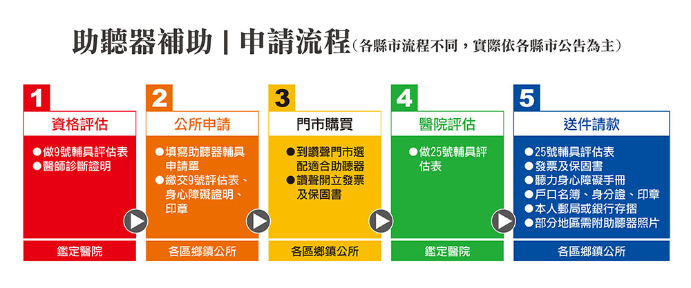 欲向政府申請「助聽器補助」,須先取得「身心障礙證明(ICF)」,經身心障礙鑑定與需求評估後,確定符合助聽器補助申請資格,得申請助聽器補助。